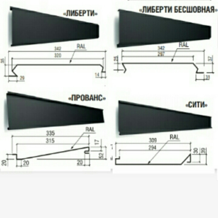 Фасадные панели изготавливаются в толщине 0,45 – 0,5 мм из рулонной оцинкованной стали с полимерным покрытием цвет RAL , а также со структурой дерева.