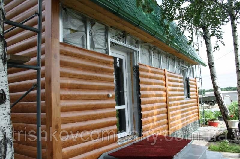 Металлосайдинг имеет вид сруба из дерева.