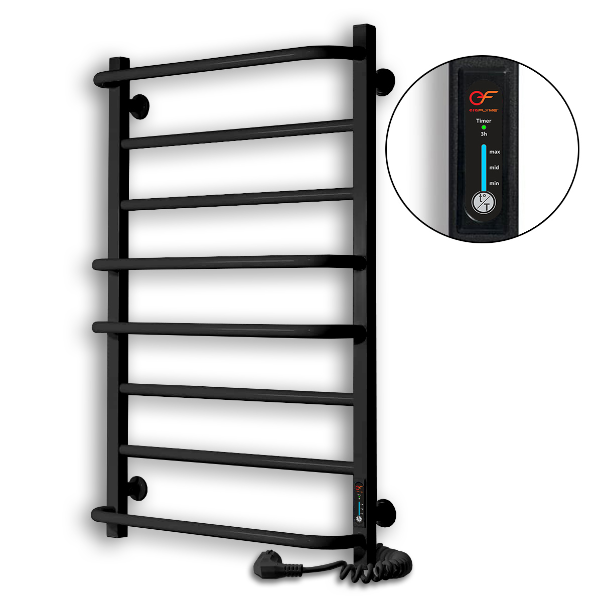 Виготовлена рушникосушка з високоякісної сталі і покрита чорною порошковою фарбою з глянцевим ефектом. Для зручності, електрична рушникосушка оснащена 8-ми горизонтальними перекладинами і вбудованим в стійку – терморегулятором з таймером. Завдяки простому, лаконічному дизайну – електрична рушникосушка відмінно підійде для будь-якиго інтер’єру і стане стильним і корисним девайсом для Вашої ванної кімнати.
