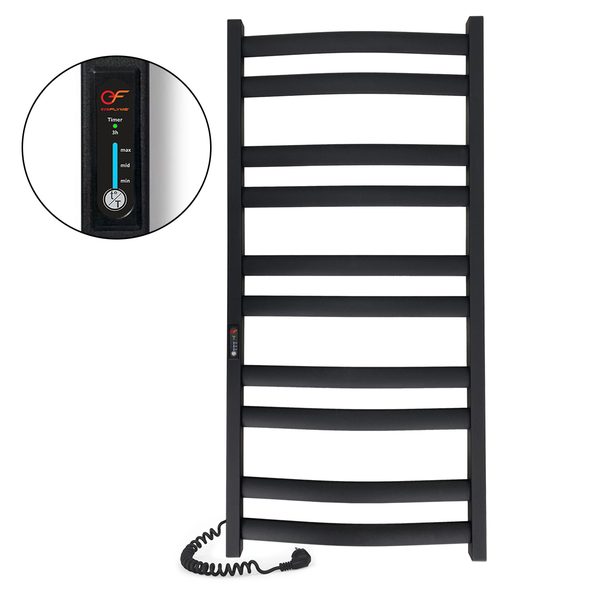 Чорна рушникосушка, виготовлена з високоякісної матової сталі та покрита оригінальною чорною фарбою, може легко встановлюватися в будь-якому приміщенні, де є потреба в сушці речей, такому як ванна кімната, кухня або пральня. Вона оснащена вбудованим терморегулятором і таймером, що дозволяє зручно керувати процесом сушіння.